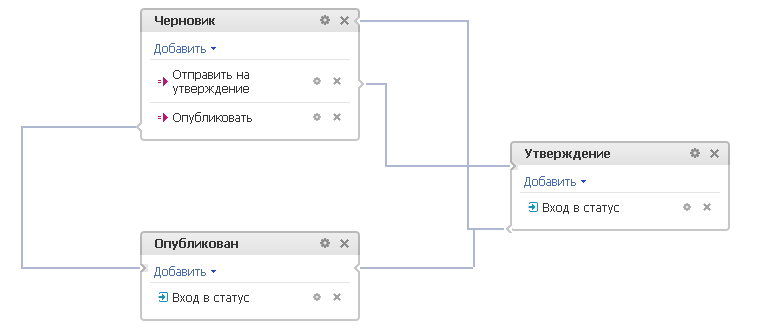 Создание такого шаблона сложнее, чем создание последовательного шаблона, зато представляет очень широкие возможности для автоматизации обработки информации. Примерная схема такого процесса состоит из нескольких статусов, включающих в себя определенные действия и условия смены статуса.
