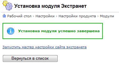 После установки модуля будет предложено запустить мастер настройки сайта экстранета, в процессе которого вам будет предложено настроить сайт экстранета.