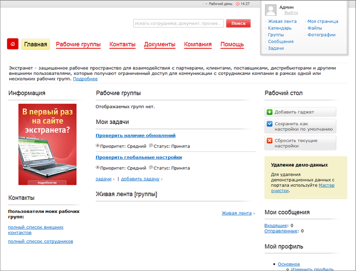 Для обычного пользователя корпоративного портала работа в экстранете ничем не отличается от работы на портале.