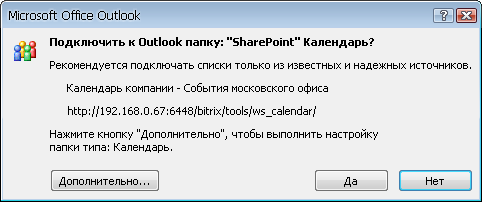 Не обращайте особого внимания на сообщения MS Outlook и просто соглашайтесь с ними, поскольку они в большинстве своем информационного характера. К примеру, появится на экране вопрос-предупреждение: <Подключить к Outlook папку "SharePoint" Календарь?> - смело жмите кнопку <Да>. Почему? Да потому что интеграция эта выполнена в полном соответствии со спецификацией корпорации Microsoft и ни каких проблем быть не может!